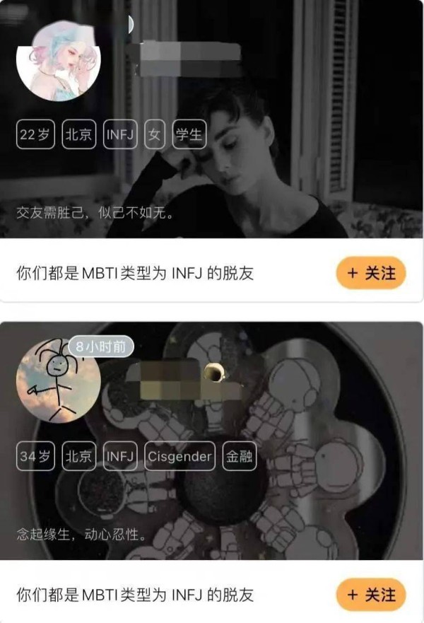 在得知自己测出的INFJ是最稀少的人格后,高阳“感觉自己很特别”,他开始有意识地去维护这个人格类型的形象,“看分析说INFJ很深沉,我就开始装作高深莫测的样子。”沉默寡言、独来独往,这些都是他刻意“训练”出来与INFJ相匹配的“外在”特质。有段时间,他总是“思考自己的行为是否符合规范,被视为普通是我最恐惧的事情”。于他而言,INFJ不仅仅是一个测试结果,而是变成了一个目标。