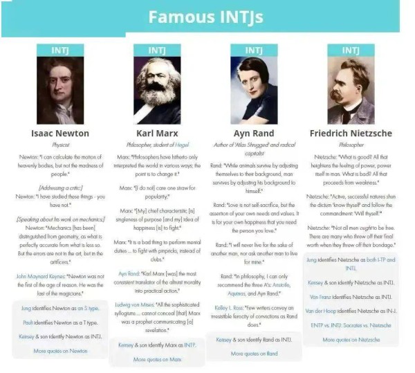 当测试者做完测试查看结果时,很难不被页面下方“和你人格类型相同的名人”吸引。当被告知自己和某位名人的思维逻辑、行为倾向相似时,用户会自然产生一股自豪感。梁爽便是因此被击中的一员,发现自己是INTJ(独立、理智、果断)后,她的第一反应是:“我这么厉害吗?和马克思一个类型!"
