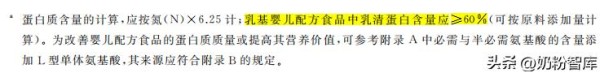 1段奶粉(0-6月龄):乳清蛋白含量占蛋白质总量的比例应≥60%;
