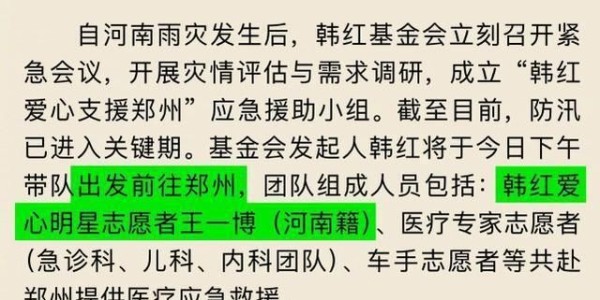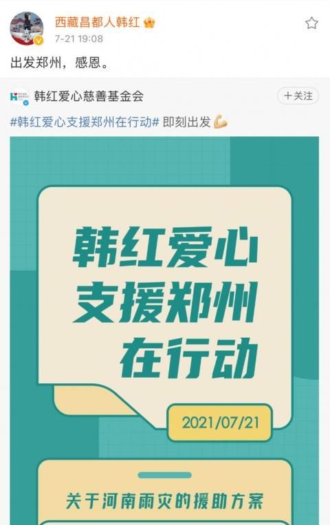 7月21日晚,知名女星韩红本人转发了爱心慈善基金会的发文,据悉,这一次他们将奔赴河南郑州。