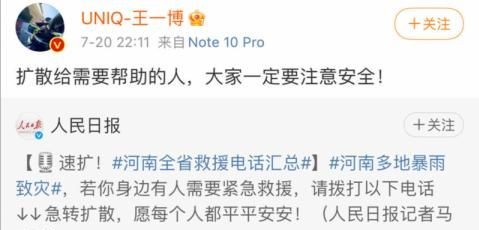 早在7月20日,王一博就曾转发过相关内容,呼吁大家一定要注意安全,并利用自己的明星效应,给需要帮助的人扩散了重要信息。