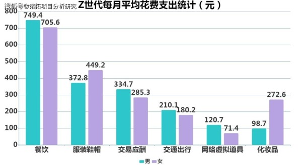 其消费特征主要表现在三个方面:一是偏爱社交性消费, Z世代大多数具有“易被种草”的体质;二是Z世代更愿意为自己的兴趣买单,更喜欢具有强烈情感代入感的产品;三是Z世代注重对颜值的追求,更愿意花钱塑造自己的颜值。据企鹅调查数据显示,饮食消费是25岁以下的Z世代的主要消费内容,因为大多数Z世代仍然处在学校生活阶段,一般会选择在餐厅或家里用餐,每月的饮食消费金额约700元左右。在鞋帽和服装方面,女生的平均消费金额超过男生的20%,男生每月在社交应酬、交通出行、网络虚拟道具方面的消费超过女生,化妆品是女生另一项不可忽视的消费内容, Z世代女生每月在化妆品方面的平均消费金额约272.6元。