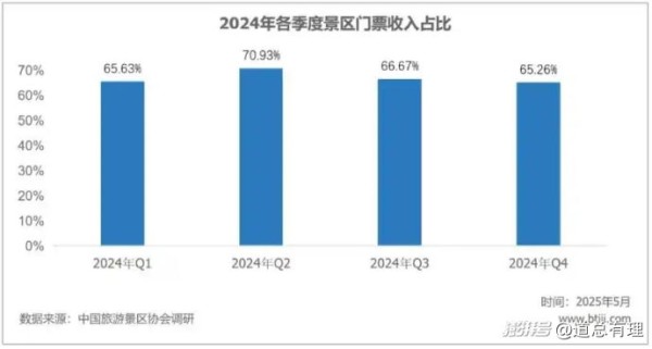 这届年轻人肯为演唱会门票花钱,却不想为景区门票支出。但在当下国内绝大多数景区的核心收入依然来自门票经济,数据显示,2024年所调研的样本景区中,各季度门票收入占比均超过65%,二季度门票收入占比最高,一度达到70.93%。