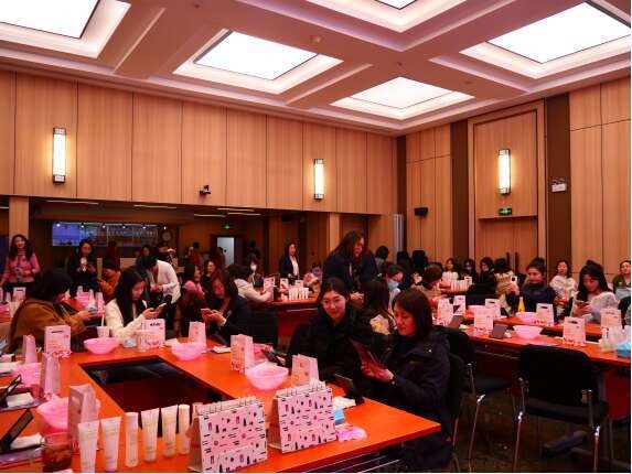 活动开始前,六张圆桌便已坐满了前来学习的女同事。圆桌上摆放着美容镜、洗脸巾以及各类护肤、美妆用品,“扫一扫”桌边二维码,还可以在小程序内拍照测肤,收获专属护肤建议。