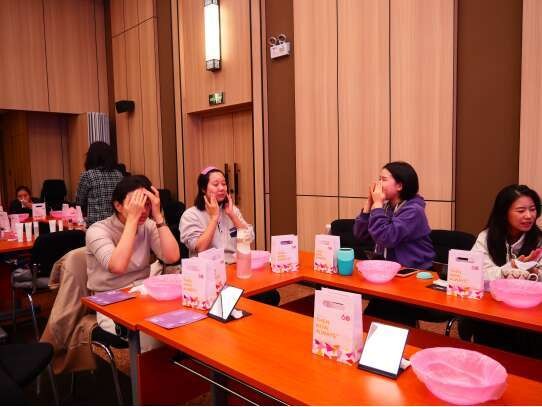 活动中,报社女同事学习五步护肤法。中青报·中青网见习记者 谭思静/摄