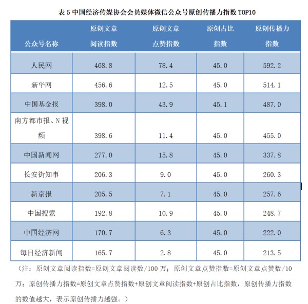 人民网、新华网、中国基金报、南方都市报 N视频、中国新闻网、长安街知事、新京报、中国搜索、中国经济网、每日经济新闻10家媒体入选2022中国经济传媒协会会员媒体“微信原创传播力指数TOP10”榜单。
