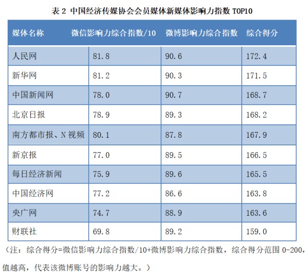 人民网、新华网、中国新闻网、北京日报、南方都市报 N视频、新京报、每日经济新闻、中国经济网、央广网、财联社10家媒体入选2022中国经济传媒协会会员媒体“新媒体影响力指数TOP10”榜单。