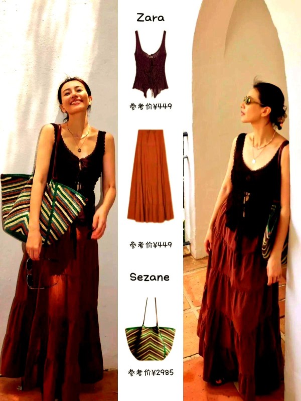 那件咖色吊带裙,以其独特的哑光缎面材质,避开俗气,质感细腻,设计富巧思,在阳光下流露出细腻的光泽,却并不显得俗气。相较于市面上常见的亮片度假裙,其设计无疑更加别致,彰显出一种别样的高级感。