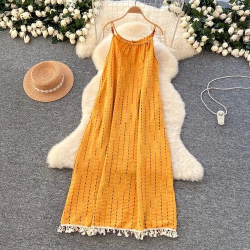 裙摆侧面的手工流苏设计是这件咖色吊带裙的点睛之笔,手工流苏在步伐中随风飘动,形成独特的动态美,这种动态的美感远胜于静态时的呈现,令人难以抗拒。