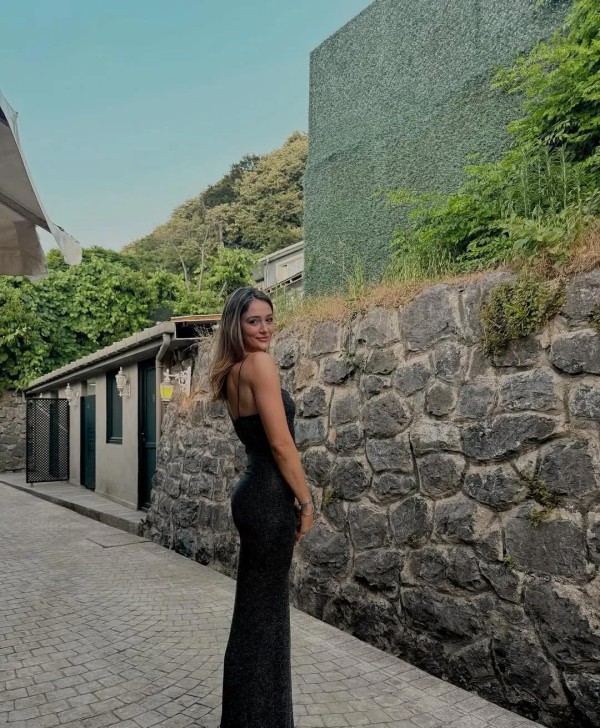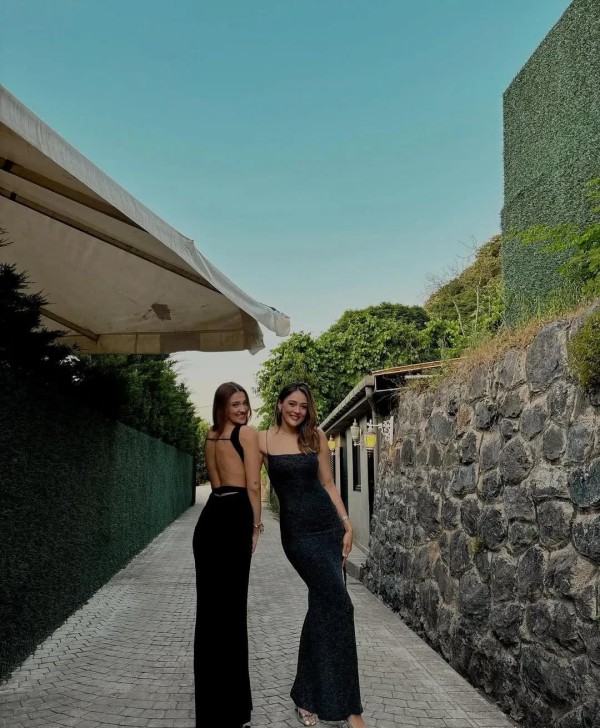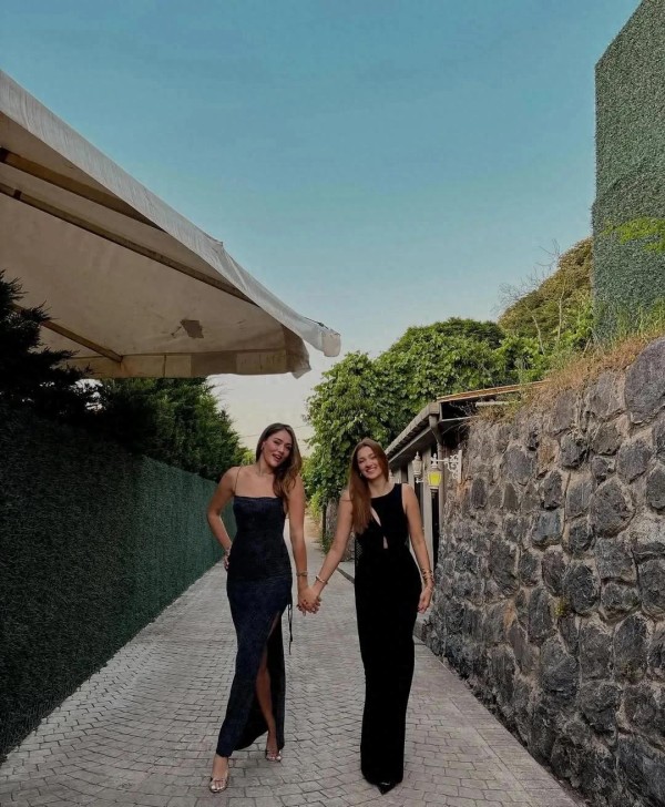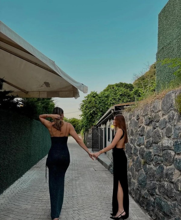 伊雷姆穿了一件黑色的露背礼服,头发自然地披下来,妆容也特别精致,整个人看起来既性感又有气场。她和姐姐站在一条小路上,背后是一面绿油油的植物墙,还有斑驳的石砖围墙。夕阳的光线很柔和,她们手牵着手,笑得特别开心,感觉就像童话里的女主角一样。