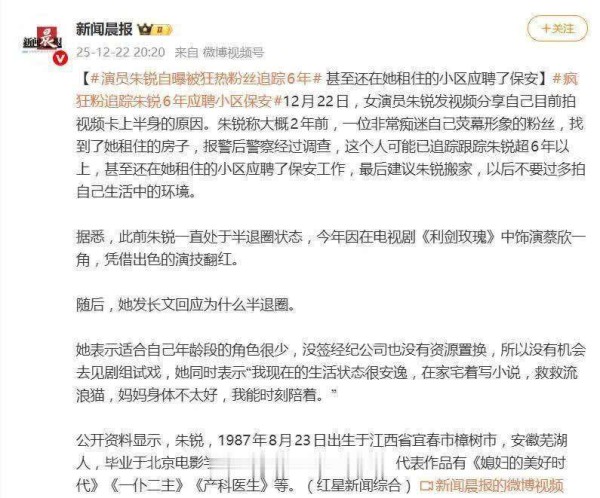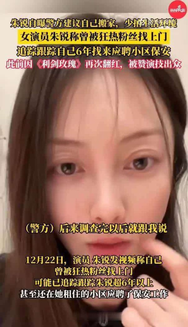 12月22日的报道中,演员朱锐发布了一段视频,揭露了一名私生饭的极端行为,令人震惊。这段视频里,朱锐解释了她为什么拍摄视频时总是只展示上半身,并且揭示了背后令人不寒而栗的原因——有一位疯狂追踪她超过六年的粉丝,竟然找到了她的住处,并差点成功应聘成为她小区的保安。