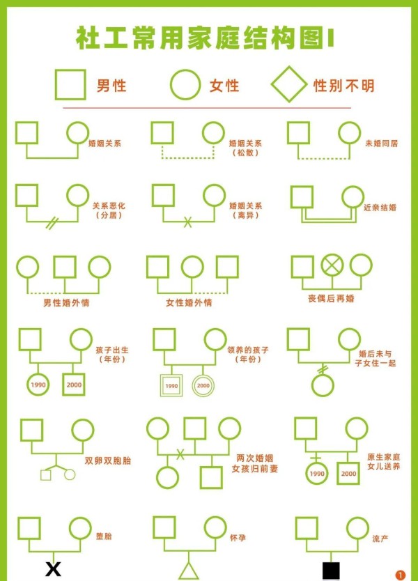 在家庭结构图中,我们采用不同的符号来代表家庭成员及其关系。例如,用圆形符号“○”来表示女性,方形符号“□”来表示男性,而菱形符号“◇”则用于表示性别不明的情况。此外,我们还通过线条符号来描绘家庭成员间的关系,如“——”表示婚姻关系,“—//—”表示离婚关系,“—/—”表示分居关系,而“.........”则表示成员间共同生活的关系。