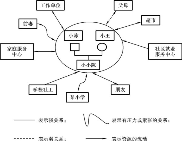 在绘制生态系统图时,首先,我们用圆圈代表家庭系统,并将服务对象置于其中心位置。接着,将与服务对象及其家庭相关的社会环境系统中的人、团体、组织或机构等用圆圈或方形表示出来。然后,通过线段将各系统相连结,线段之间的距离反映关系的亲疏程度,线条的形态则代表关系的本质:实线表示紧密关系,虚线表示松散关系,曲线则可能暗示问题、张力或紧张关系。此外,线条上的箭头还用于指示关系的方向性。