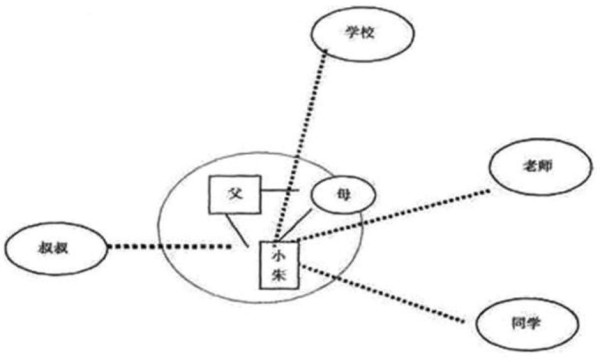 1.家庭系统与周围环境系统之间几乎没有良性的交叉和双向互动。小朱周围存在四个环境系统, 从小朱出发指向这四个系统的线条都是非常弱的关系,即叔叔屡次找小朱谈话未果,小朱与 老师、同学的关系紧张,学校多次对他的问题釆取开除的方式。但是,小朱的家庭系统内的 关系还是很好的。