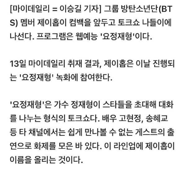 13日采访结果显示,J-hope将参加当天进行的《妖精在炯》的录制。
