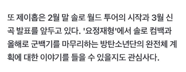 另外,J-hope将于2月底开始个人世界巡演,3月将发表新歌。在《妖精在炯》中,也许能听到关于个人回归和今年结束军白旗的防弹少年团完整计划的故事也备受关注。