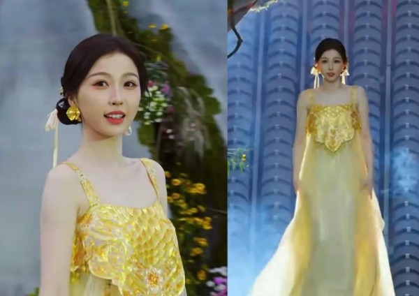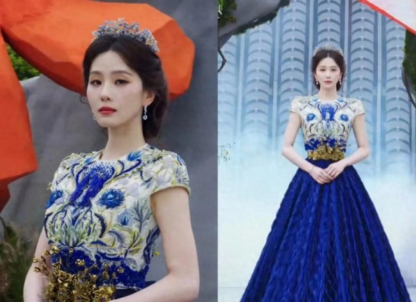 刘诗诗那天是开场嘉宾。 第一套造型,蓝色鎏金刺绣长裙,头上戴了个蓝水晶皇冠。 很多人一看就喊,这不是《仙剑三》里的龙葵吗? 现场真有位做非遗的博主,复刻了一个龙葵的头饰送给她。
