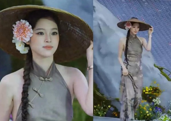 欧阳娜娜的打扮总是很有想法。 这次她穿了件改良的旗袍,上面有花朵装饰,还戴了顶斗笠。 有人评论说,她这身可以直接去拍那种古镇的宣传片了,带点非遗的味道。