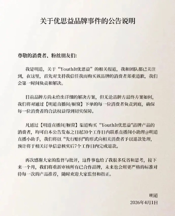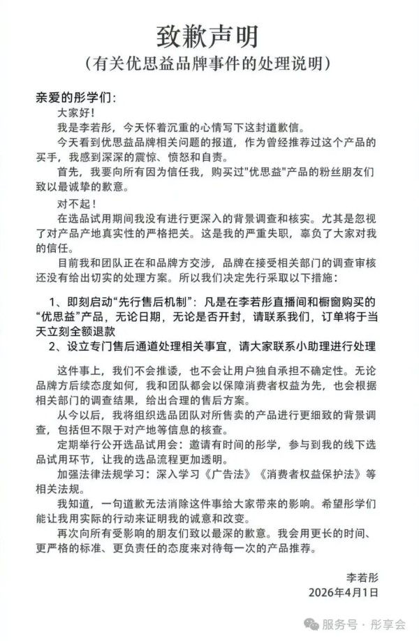 与此同时,章小蕙、李若彤、明道等十余位相关明星,或签约代言,或直播带货,成为该品牌营销传播的关键节点。事件发酵后,部分明星发布“致歉声明”,承诺“全额退款”。