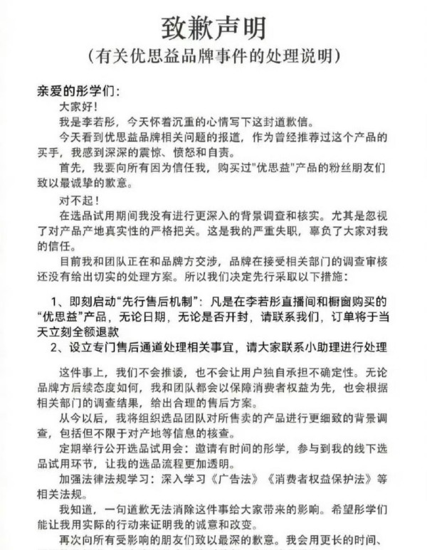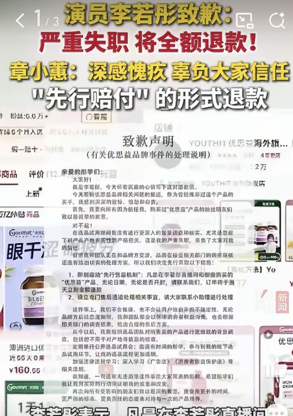 李若彤承认在选品试用期间没有进行更深入的背景调查和核实,尤其是忽视了对产品产地真实性的严格把关。 她启动了先行售后机制,凡是在她直播间和橱窗购买的优思益产品,无论日期、是否开封,当天立刻全额退款。