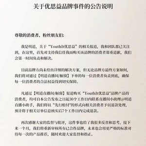 凡通过【明道直播间/橱窗】渠道购买“YouthIt优思益”品牌产品的消费者,均可自本公告发布之日起30个工作日内联系直播间小助理@明道直播小助手,我们将以“先行赔付"的形式向相关消费者予以退款处理,预计将于相关订单信息核实后7个工作日内完成退款。