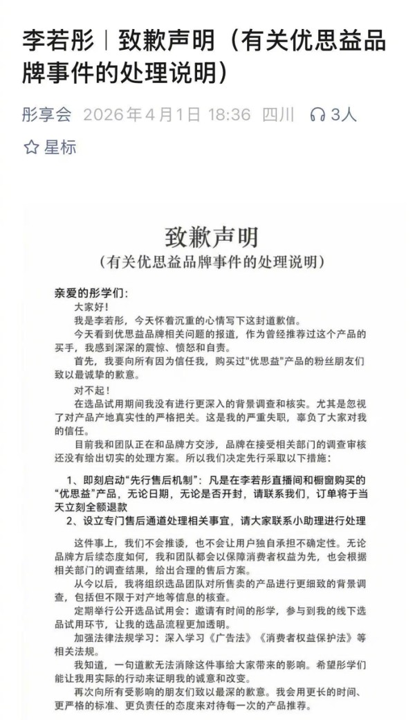 【#李若彤致歉##李若彤直播间优思益全额退款#】据@中新经纬 报道,近日,优思益因被央视曝光“假澳洲进口”已全网下架,多位明星、主播曾带货相关产品。4月1日,@中新经纬 发现,李若彤直播间官微“彤享会”发布致歉声明,“李若彤专属小助理”随后也在朋友圈发布该声明。该声明称:在选品试用期间我没有进行更深入的背景调查和核实。尤其是忽视了对产品产地真实性的严格把关。这是我的严重失职,辜负了大家对我的信任。李若彤表示,即刻启动"先行售后机制":凡是在李若彤直播间和橱窗购买的"优思益"产品,无论日期,无论是否开封,请联系我们,订单将于当天立刻全额退款。