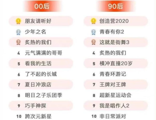 90后观众对于综艺节目喜爱的类型更偏向于选秀节目和竞演节目,因此,在去年的收视结果当中,《创造营2020》和《青春有你2》囊括了去年收视成绩的金银牌,不仅如此,从这两档选秀节目当中成团出道的硬糖少女303和THE9也得到了高度的关注。