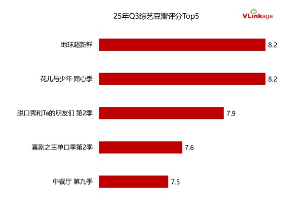 下图为《地球超新鲜》的口碑表现,可以看到,在2025年Q3的综艺节目里,豆瓣开分8.0分、并持续上涨至8.2分的《地球超新鲜》,不仅是今夏受众覆盖最广的综艺,也是同期口碑最佳的节目。
