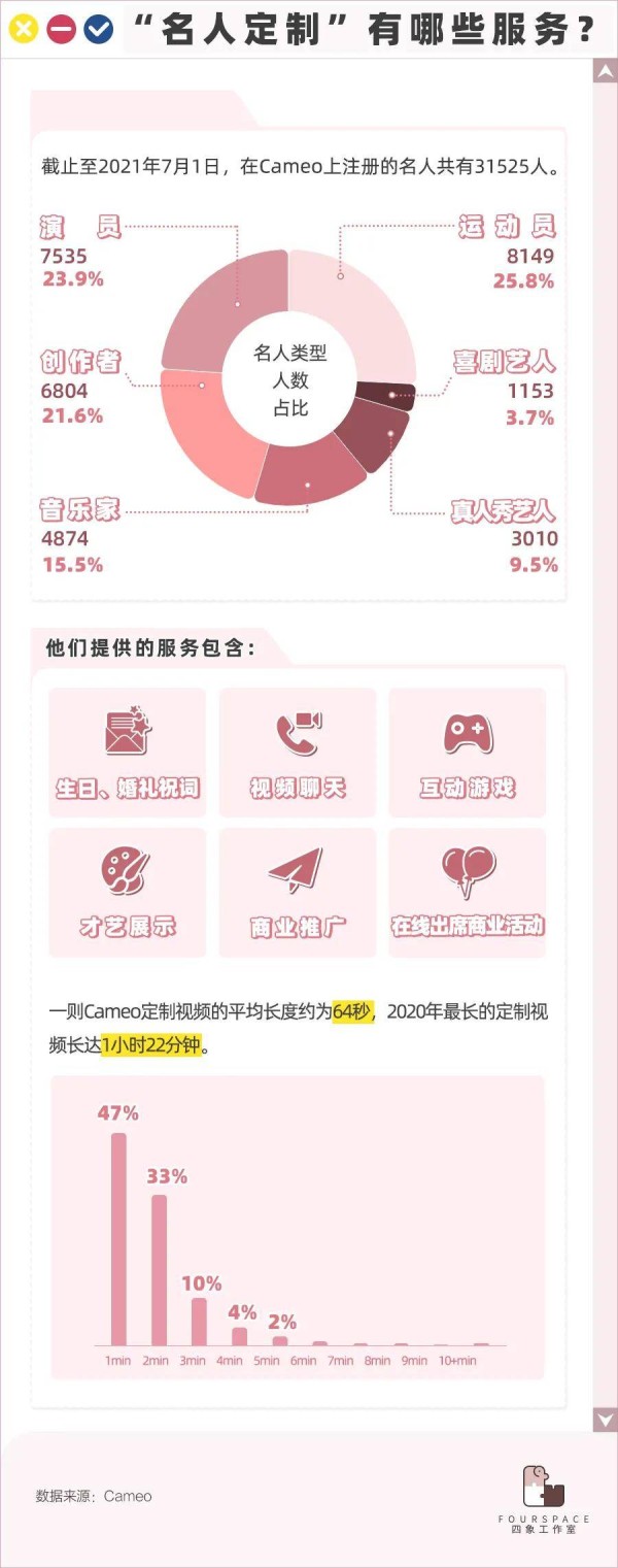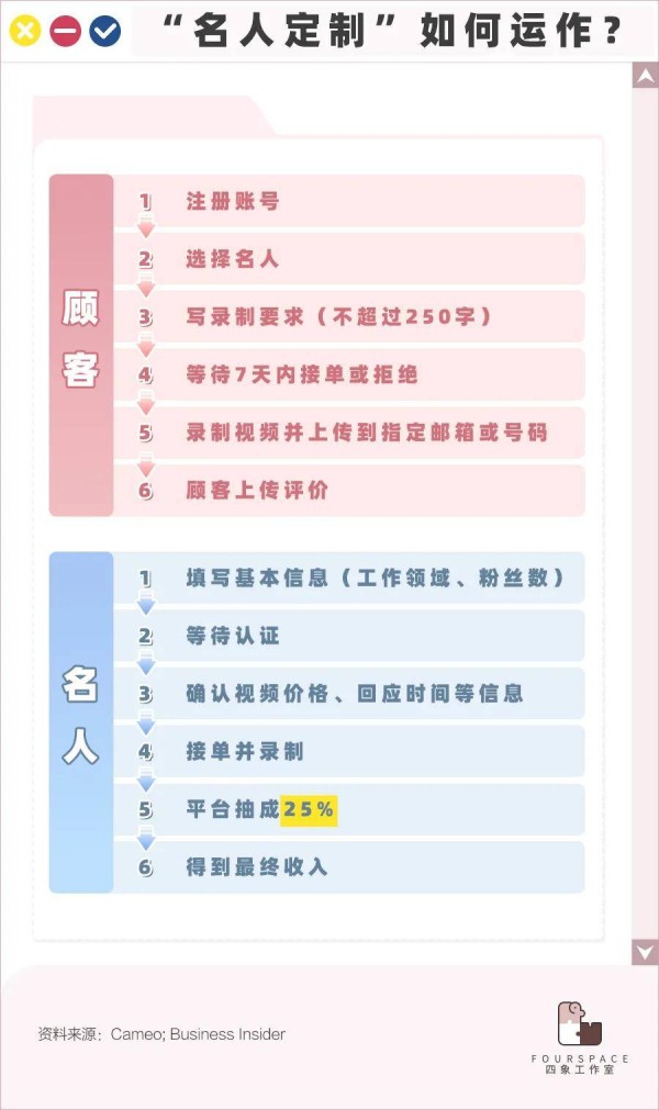 就像外卖骑手、快递员和滴滴司机一样,所有想要加入名人阵列的申请者,都要通过平台的认证,才可以接单。每则视频的价格必须明码标价,在规定时间内录制完成,每一则视频的收入平台会抽成25%,流程十分标准。