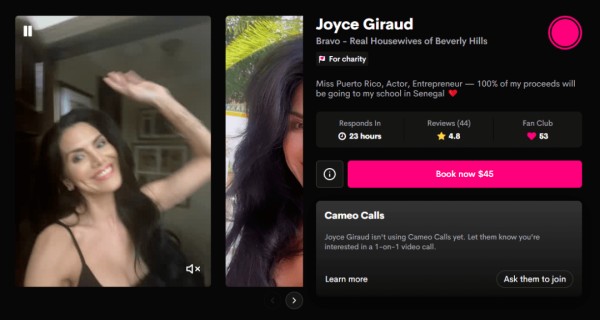 Cameo上的名人除了来赚钱的,还有纯粹享受名人身份,或者来做慈善的。曾出演过贵妇真人秀《比弗利娇妻》的Joyce Giraud就以一条视频45美元的价格,把收入全部捐给自己在塞内加尔建的小学。