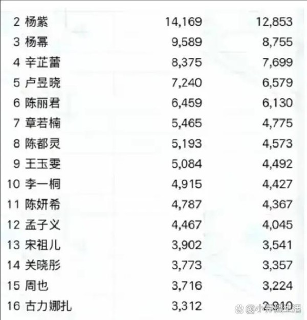 榜单里,杨紫全端数据在18000多,移动端在17000多,和第三名杨幂差距不大。杨幂全端在17000多,移动端在16000多。第四到第十名数据差距就小很多,大多在一万到一万五之间。榜单上还有赵露思、虞书欣、迪丽热巴、关晓彤等,她们各自的全端数据都稳定增长,但没有冲到前三的势头。