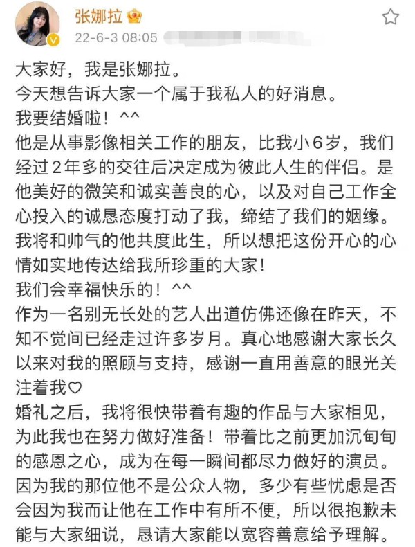 6月3日端午节时,张娜拉宣布了结婚的好消息。 由于以前在中国发展了一段时间,给观众留下了深刻的印象,她结婚的消息一出,就引起了很多中国网友的关注。