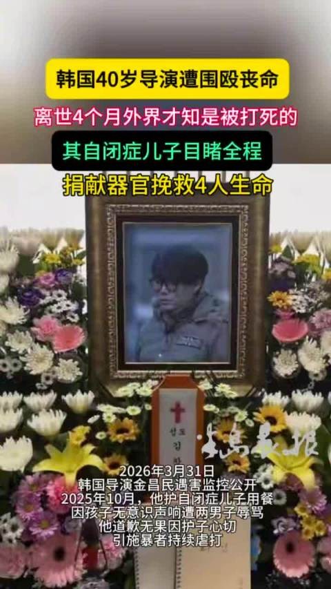 【#韩国40岁导演遭围殴致死引众怒#】#韩国导演带儿子吃宵夜被围殴致死# 据媒体报道,2026年3月,韩国40岁导演金昌民的真实死因曝光,打破了此前“突发脑出血离世”的说法。 事件真相是2025年10月20日凌晨,金昌民导演带着自闭症儿子吃宵夜时,因孩子的无意识声响遭邻桌两名20多岁男子辱骂,他道歉无果
