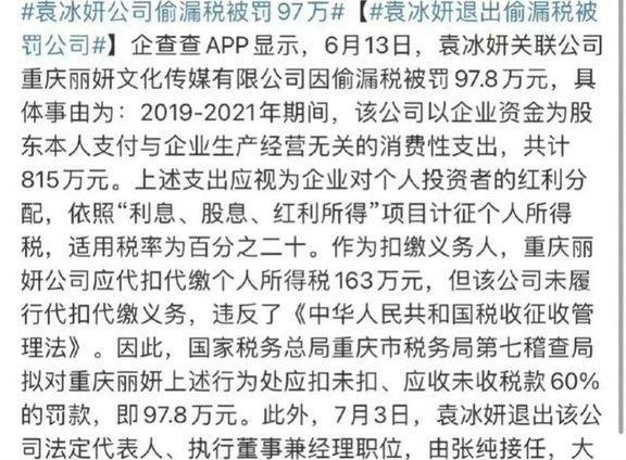但这里面还有个细节值得注意。袁冰妍公司被罚的这笔税款,金额实在太小,连有些网友都在质疑,这是不是“故意”报出来的低金额,只是为了“走个过场”?而且,6月30日,也就是被罚不到半个月后,袁冰妍就退出了公司。这个操作,很像是提前“做准备”,摆脱法律和舆论风险。