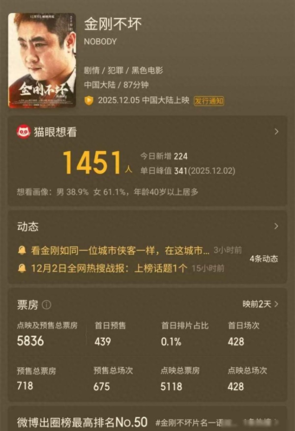 12月3日,电影《金刚不坏》即将登陆影院,然而预售票房仅以718元收场,全国共安排了428场放映,平均每场的收入微薄至极。尽管之前金鸡影展曾进行过几千元的点映,为票房增添了些许亮点,但仅从院线预售来看,可谓票房惨淡,几乎无人问津。这反映出并非无人关注这部影片,而是观众普遍缺乏购票观看的意愿。
