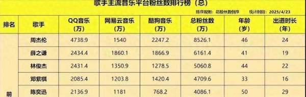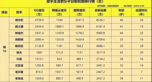 接下来,我们来看排名前十的歌手:周杰伦、薛之谦、林俊杰、邓紫棋、陈奕迅、张杰、许嵩、汪苏泷、毛不易和李荣浩。这些人几乎构成了当下华语乐坛的基石。其中,许嵩和汪苏泷都是当年“三巨头”时代崛起的音乐人。个人而言,我觉得两者的发展方向有所不同,一个正在走下坡路,另一个则在不断上升,但我不便多加评论。