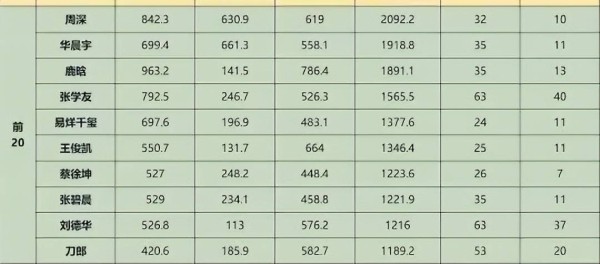 再往下看11至20名的歌手,情况就更有趣了。周深的排名竟然超过了华晨宇:排名依次为周深、华晨宇、鹿晗、张学友、易烊千玺、王俊凯、蔡徐坤、张碧晨、刘德华和刀郎。此处再关注粉丝数据的意义已不大,因为已不是主流歌手之间的竞争。这十位中,只有周深、华晨宇、张学友、张碧晨、刘德华和刀郎算得上是主流歌手。值得一提的是,刀郎的真实数据受到了一定的压制,具体原因不再深入探讨。