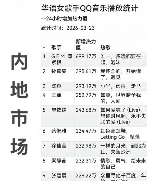 华语女歌手热力值排名,歌手最热3首歌曲对比,邓紫棋唯一最火