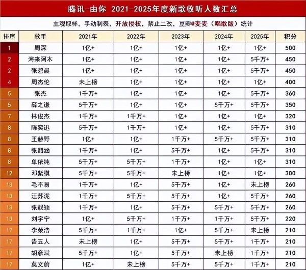 需要指出的是,该榜单主要统计的是“新歌”收听人数,而非总作品播放量。