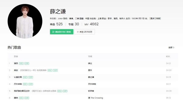 音乐平台歌手粉丝排名:薛之谦稳坐内地第一,年轻歌手格局确定