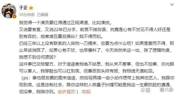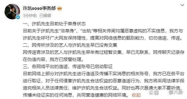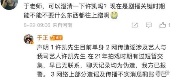 就在众人八卦指数爆表时,许凯工作室和老板于正也不是吃素的。打假声明、报警通告、底气十足的反击——这一套流程下来,那叫一个专业。“假的!假的!全都是假的!已经报警!”声明里写得铿锵有力,连带着对所有编造谣言的账号狠批了一通,信誓旦旦要通过法律手段维护许凯的名誉。于老板还在评论区直接发声,“现在许凯还是单身呢!你们别瞎猜啦!”网友直接笑出鹅叫,“老板这是恨不得把员工婚姻状况印小册子随身发啊!”