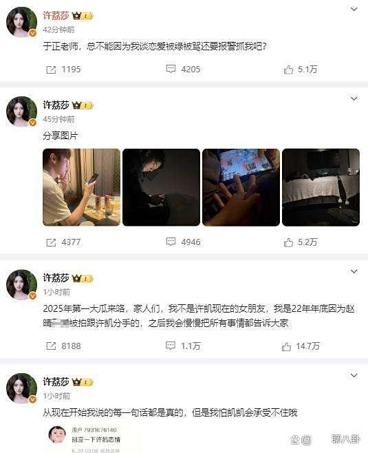 许荔莎这一锤,让网友瞬间迷糊了:“原来还有赵晴?三人行?还是四角恋?这瓜越吃越大……”有人调侃这剧情可以改编成偶像剧了,许凯演自己都绰绰有余。更魔幻的是,每一步信息更新,都会掀起全网的群嘲狂欢,网友段子手们全员上线,各种表情包、神评论飞速出炉,把这桩恋情推向了流量巅峰。