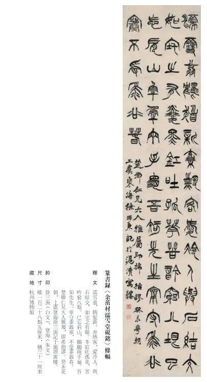 清道光年间进士徐树铭评金罍书曰:“篆隶兼工,笔力沉雄,能融秦汉碑额与邓石如篆法为一,自成面目。”可谓的评。徐三庚年轻时刻苦力学,遍临秦汉碑版,善学善用,各体兼擅,尤精隶篆。浙江省博物馆所藏其楷书《蘅花馆诗钞》是以金粉书于磁青纸上,录好友王韬诗数十首,册尾又以隶书作跋,述与王韬数十年之谊,并望好友窗明几净时展阅,足见二人友谊,也显徐三庚之重情重谊。此书为特件,笔势畅达,精整雅致,历百四十余年,仍焕然如新,可不宝乎!西泠印社所藏临《天发神谶碑》六尺四屏,若篆若隶,字势雄伟。此碑临习取法不易,向为书家难诣之境,徐三庚心契其韵,融贯己法,落笔自如,成为其书、印的一大特色。此四条屏百七十字,一气呵成,极有意趣,三十余字的隶书款识,更叹为绝配矣!杭州博物馆所藏其五十八岁篆书《余茁村濡雪堂砚铭》条幅(下图),篆法清健灵动,用笔刚柔相济,因精通篆法,故能随字铸形,如“翁、鹤、邻、龟、谷”等字均逸势奇状,精彩动人!