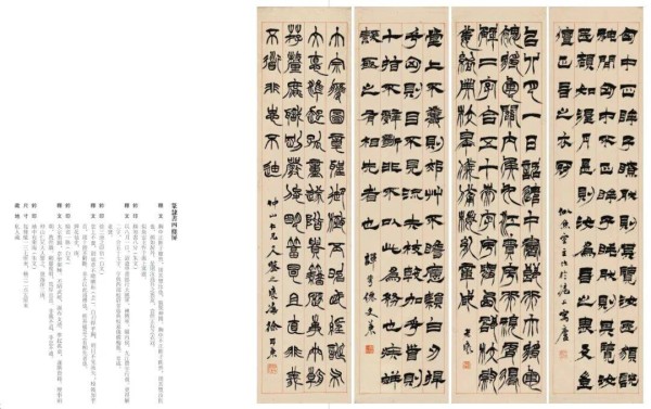 金罍晚年,篆隶尤精。本册中有篆、隶作品各一件,同书王元长《谢竟陵王示扇启》一文,均六十岁左右之作。篆书作品为册页,以邓石如、吴让之为本的变体小篆,圆润雍容,清劲挺拔,为其晚年最精到典雅之作。隶书作品则苍郁雄畅,丰神潇洒,自具幽邃之致。金罍暮年,心向古雅,独钟此文,以其文辞典雅,与其篆隶骨势相融相合也。
