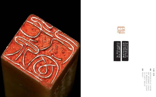 西泠印社藏徐三庚印百数十方,本册中收录近二十方,“千泉一尺室”朱文印(上图),是金罍六十岁时为冯兆年得西汉铜尺所刻的斋名印。此印饱满而飘逸多姿,用刀生辣遒劲,跌宕回旋,无不如意,刀笔入化境也。“成达章印”“若泉”两面印,金罍四十三岁时刻,款曰:“仿完白山人两面印。”金罍年轻时即苦学邓、吴二家,邓完白的苍浑神理,金罍尤为欣赏。此二印浑朴苍润的笔墨感深得完白山人神髓,金罍善学善用,疏密更加强烈,用刀更奔放,完全是金罍本家特色。“不系舟”朱文印,款曰:“癸未三月廿日庚子,作此以遣,褎海。”其时年五十八岁,乃晚年随顺自然之境。此印绝妙,上定下动、左斜右承的布局,在晚清篆刻中绝无先例,印文看似松散,实则环环相扣,字随情走,形由意生,真如不系之舟。此印用刀轻重徐疾,随意生发,充满动感!“白门史致道仲庸父章”九字朱文印,款曰:“辛谷仿王象字,乙丑二月。”金罍时年四十岁,此印以“道”字中心立定,余字各姿环绕,雍容茂密,多字末笔作悬针状,凸现《天发神谶碑》的韵味。此印是金罍四十岁左右的一方精到雅致的代表作。
