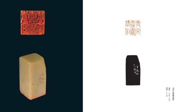 本次展览有幸征得私家所藏的徐三庚为左宗棠所刻的“青宫太保愙靖伯”朱文印(上图),3.5厘米见方,印面分三行排列,“青宫”二字列首行,“太保”与“愙”平占中行,结字略宽,“靖伯”列尾行,结字略小,质而不滞。用刀端凝遒劲,笔画交接处,锋刃痕迹显见,“愙”字硕大,“靖”字的灵动,“伯”字右部流动有神,均极富对比。此印凝练雍容,尽显华贵气象。徐三庚为爱新觉罗·奕䜣所刻的“和硕恭亲王”白文印,1.7厘米见方,印分二行排列,结体疏密有致,用刀婉转挺秀,字体的直、横、斜的互衬,使印面极富流动感。“王”字的三长横,虽细却遒劲凝重,可谓点睛之笔也。“水流花放”朱文印,为金罍放意之作,锋颖犀利,沉着痛快,极与印文相合。刻毕余兴未息,又刻长款曰:“洋洋洒洒,气旺神流。一波三折,活水源头。奇花初胎,尽态极妍。指撝如意,妙合自䕼。梦惺道兄雅擅八法,以‘水流花放’四字属篆诸印。不揣芜图,粗成俚句,率以报命,即求正之。金罍徐三庚未定草。”允为其印中特品也。私家藏品中尚有十五字朱文生肖自用印,各三面长款的“徐三庚长年”朱文印、“褎海”朱文印,另有公藏的“禹寸陶分”大朱文印等,因前有赘述,此不复多言。