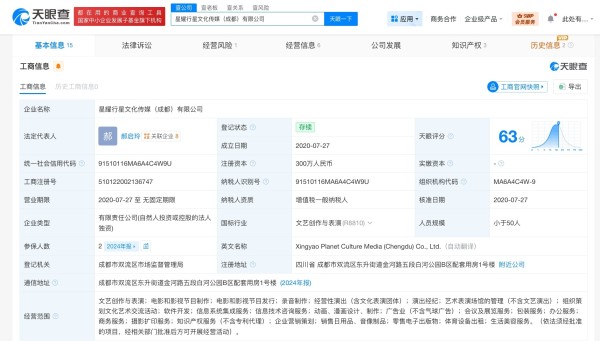 星耀行星文化传媒(成都)有限公司成立于2020年7月,法定代表人为郝启玲,注册资本300万人民币,经营范围含文艺创作与表演、电影和影视节目制作、电影和影视节目发行、录音制作、经营性演出等。股权全景穿透图显示,该公司由月瀛文化(上海)有限公司全资持股,后者由张杰、郝启玲分别持股99%、1%。