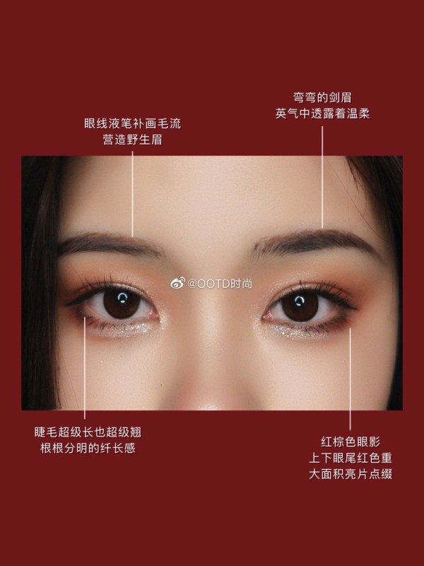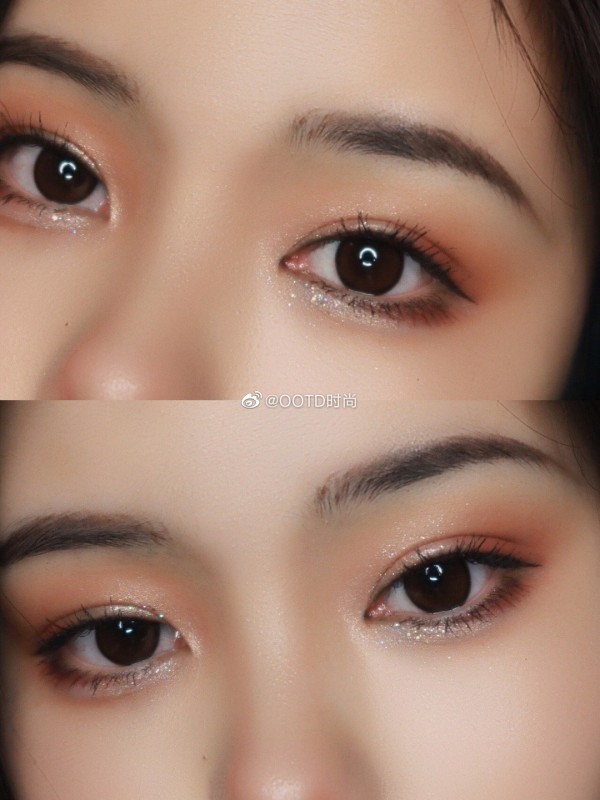 ♥️ 尤其是这优秀的眉毛,不同于普通的剑眉,增添了温柔的感觉。红棕色眼影➕亮片,妩媚又璀璨。