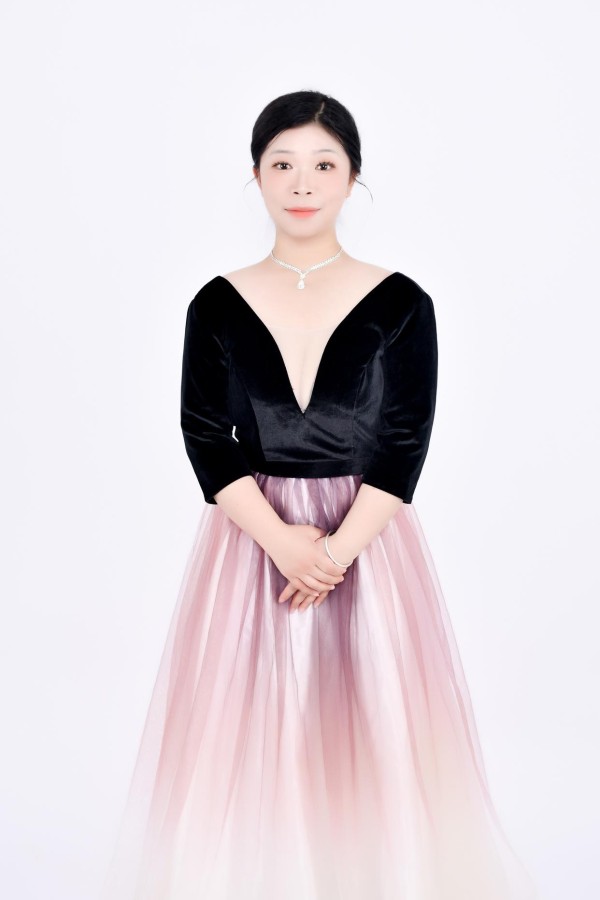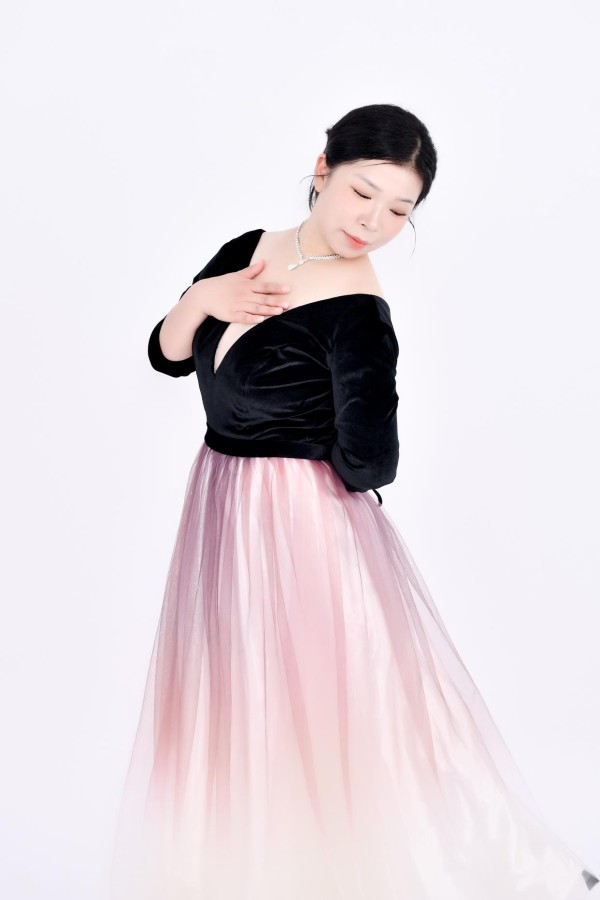 若说前面是时尚与浪漫的交织,当她穿上华丽的黑丝绒上衣搭配粉紫色渐变纱裙,又切换成了高贵典雅的模式。站定后双手交叠的端庄,或是轻搭胸口、侧身而立的优雅,都带着一种舞台中央的瞩目感,仿佛下一秒就能踏上晚宴、舞会的场地,成为众人目光焦点,这类造型,对于高端礼服品牌展示、晚宴主题拍摄,是绝佳的诠释,把精致与格调拉满 。