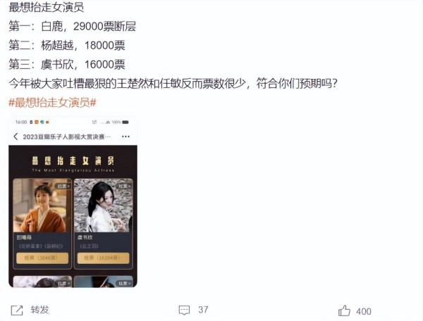 从整体上看,2023年最想抬走男演员排行榜的竞争还是非常激烈的,最终谁会获得第一名,我们还无法确定,但看到2023年最想抬走女演员排行榜,网友们却忍不住说:这算是断层了吗?